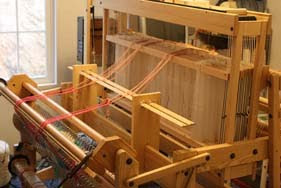 This one I did in 2008 in class; there is stitching, rust dye, stamps, painted dye and hand embroidery on it. Both of these were just junk pieces of material. I found the above at Habitat for Humanity in Asheville it is upholstery fabric. I used junk material because I had no idea how any of this would turn out. I had done a color wheel warp quite awhile ago and found purple and orange were an interesting combination. The piece that I will be working on next is purple, yellow, orange and some red tinges. Guess is was a phase I was going thru! This one I can take my time on and really embellish to my hearts content! The next piece is cotton material and will be easier to work on besides.